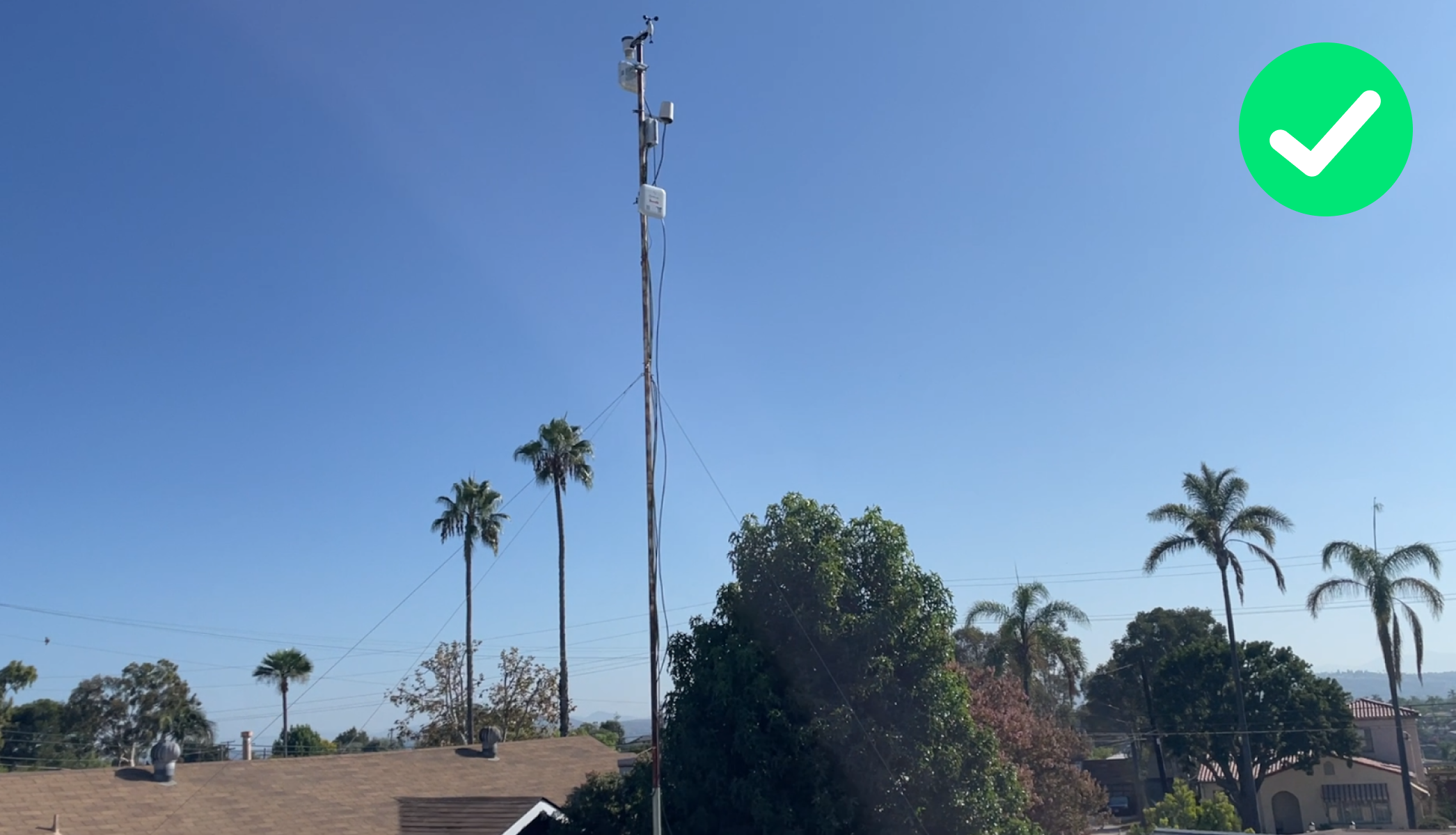 The station is deployed on an appropriate mast, but it is not at the highest possible point of the area (there is a higher building to the north and tall trees to the south). There is also a chimney below it.